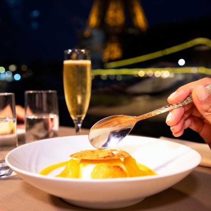Privilège service: 2,5 hr cruise, window table, all-inclusive menu with a choice of à la carte dishes (1 starter + 1 main dish + cheese + 1 dessert), drinks (appetizer, 1/4 bottle of wine per person, mineral water, and coffee), musical entertainment.
