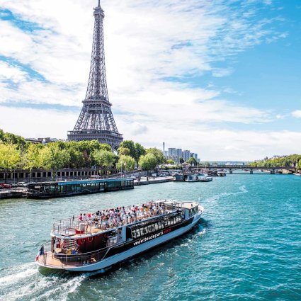 Step aboard an elegant sightseeing boat at the foot of the Eiffel Tower and discover the prestigious monuments of Paris from the Seine River.
