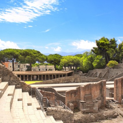 Explore one of the most significant archaeological sites in the world, Pompeii. Follow your guide through the 2000-year-old cobbled streets and see the shops, temples, theatres, and luxurious villas of rich merchants. The ruins show evidence of civilization, architecture and art of this ancient Roman town which was buried by ashes from the eruption of Mount Vesuvius in 79 AD.
