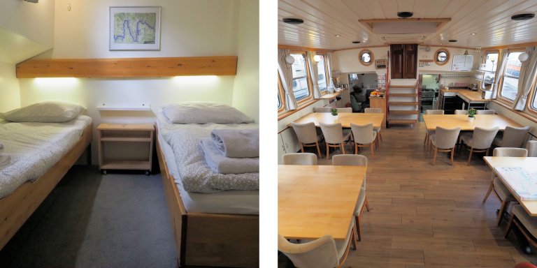 Cabin plan: 2 luxury double cabins (separate seating), 1 twin cabin (beds can be placed together, small desk between the beds), 3 twin cabins (beds fixed on the floor, small desk between the beds) 1 front double cabin (smaller cabin in the front of the barge, accessible via steep stairs)